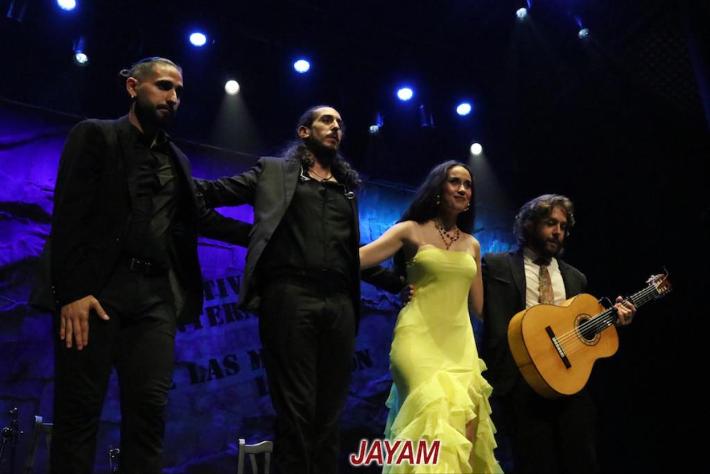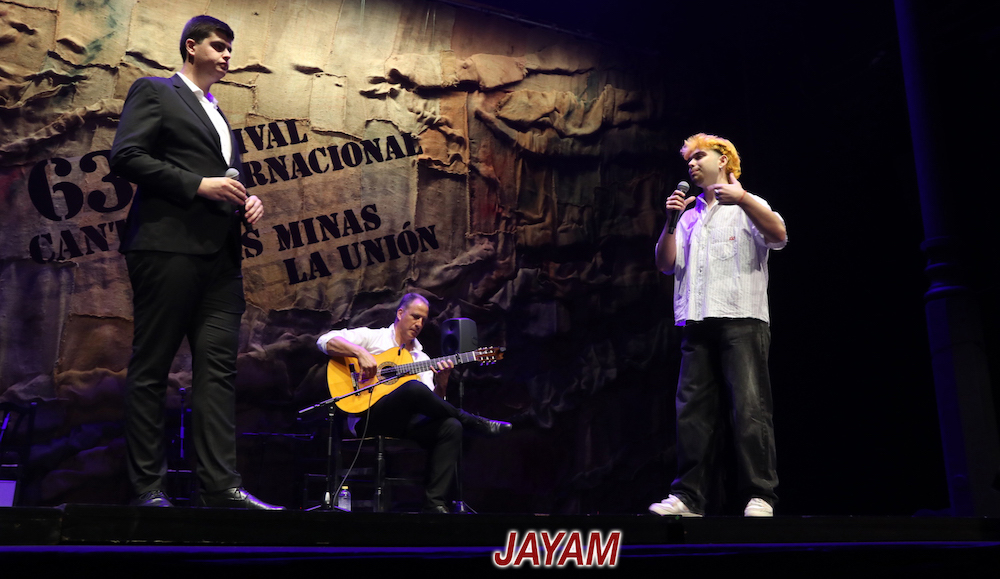 Tomás Parra y Miguel Ángel Sánchez ‘El Marqués’, representando al certamen 'Pascual García Mateos', abrieron la gala de los vencedores de la anterior edición del Cante de las Minas. En las fotos superiores también figuran los bailaores Yoel Vargas y Rocío Garrido.