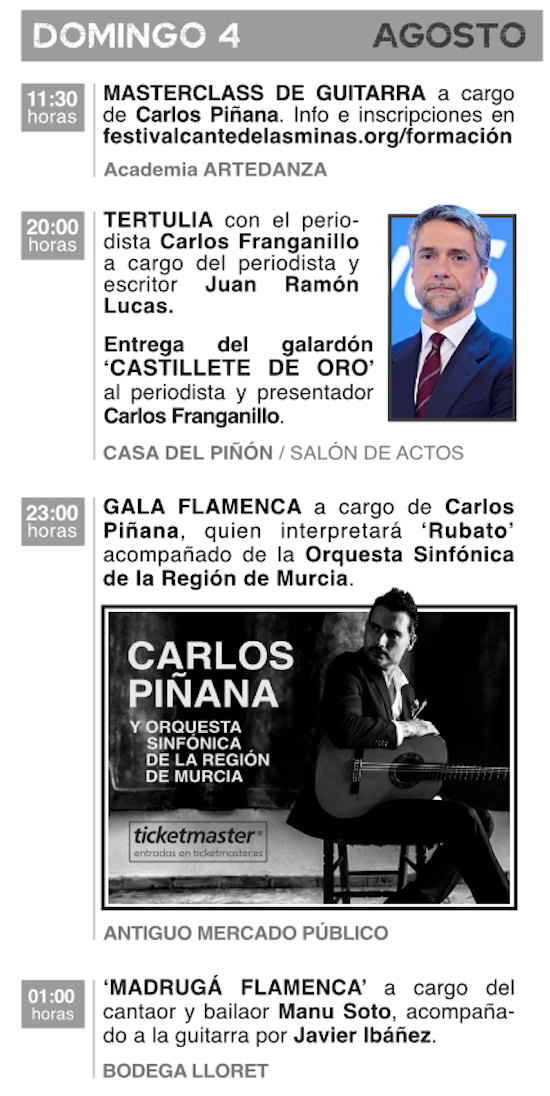 Carlos Piñana ofrece la clase maestra matinal en Artedanza y protagoniza la gala nocturna junto a la Orquesta Sinfónica de la Región de Murcia. A las ocho de la tarde hay tertulia entre los periodistas Carlos Franganillo y Juan Ramón Lucas, para después recibir el primero el ‘Castillete de oro’. El programa lo cerrará la ‘Madrugá flamenca’ en Bodega Lloret.