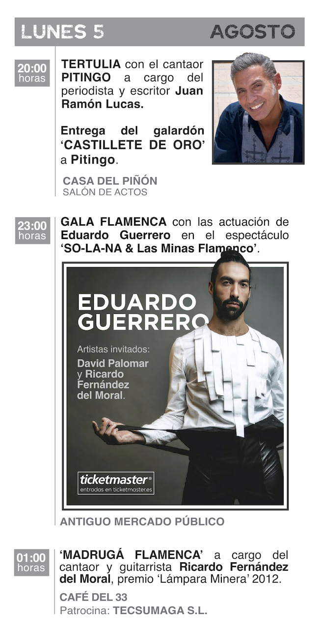 Eduardo Guerrero, con el espectáculo ‘SO-LA-NA&Las Minas Flamenco’, junto a David Palomar y Ricardo Fernández del Moral protagoniza una nueva gala flamenca en la ‘Catedral del cante’. La ‘madrugá flamenca’ estará a cargo del cantaor y guitarrista Ricardo Fernández del Moral, premio ‘Lámpara Minera’ del 2012. Será en el Café del 33. Antes, por la tarde, Pitingo recibe el ‘Castillete de Oro’.