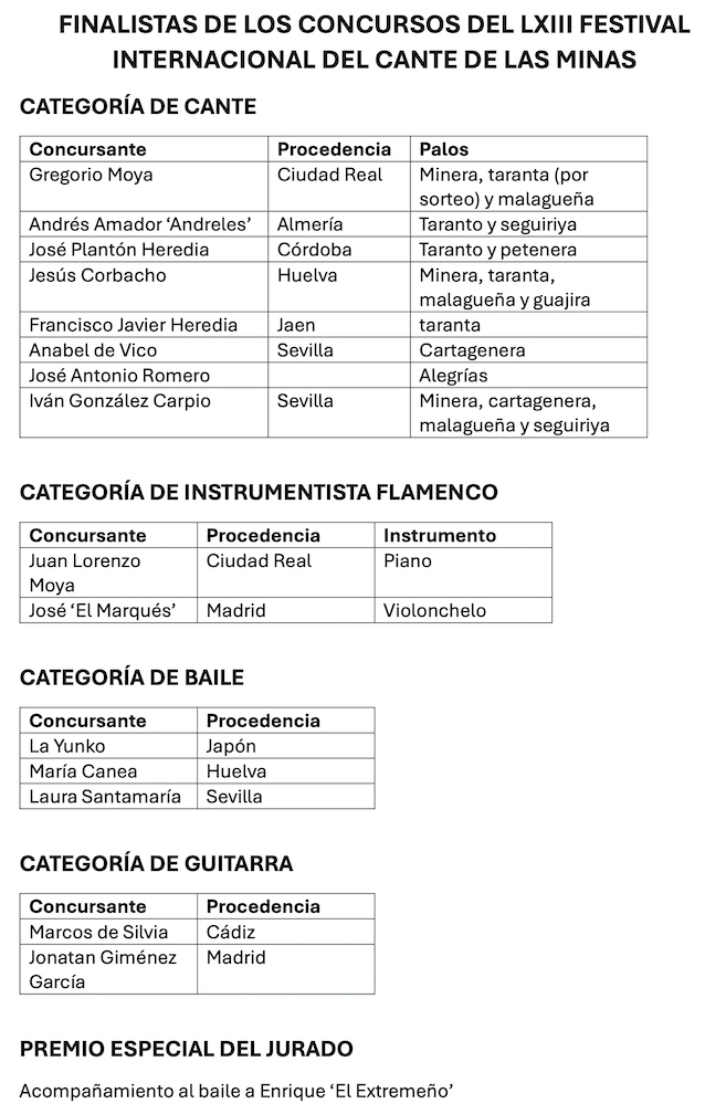 En la categoría de cante, reseñar que la sevillana Ana Isabel Rodríguez Rosado (Anabel de Vico) triunfó el pasado año en la modalidad de los cantes mineros de pasión del Cante de las Minas y que hace unos meses fue la ganadora del concurso de saetas de la Semana Santa Minera de La Unión, en el que, otro finalista de esta noche, el gaditano José Antonio Romero, fue segundo.