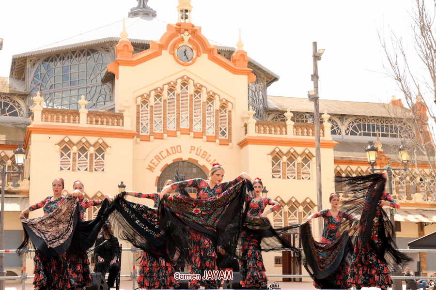 Qué agradable mañana en la hoy soleada plaza de Joaquín Costa de La Unión disfrutan de la espectacularidad del baile con la fachada del modernista Mercado Público de fondo.