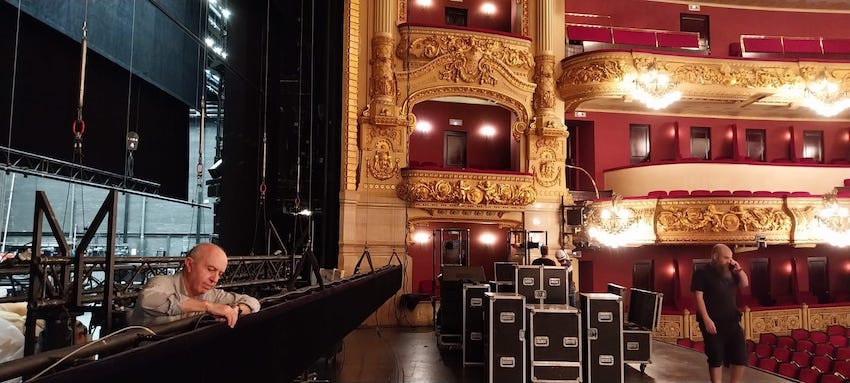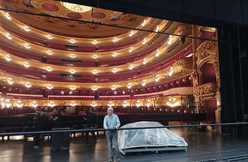 El artista unionense Esteban Bernal Aguirre, con la escenografía del gran telón escultórico-textil de 12 metros de ancho que hoy envolverá la gala flamenca en el emblemático escenario de Barcelona, propone un paseo de sensaciones por los colores y texturas del corazón de la Sierra Minera de La Unión, por la emblemática raja del Cabezo Rajao. En la foto, durante las labores de montaje.