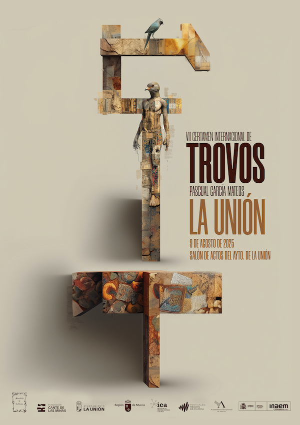El VII Certamen Internacional de Trovo ‘Pascual García Mateos’ ya tiene cartel. El artista, escritor y comunicador unionense Onésimo Samuel Hernández Gómez ha sido el encargado de diseñar la obra que anuncia una nueva edición de este evento que pone en valor el arte de la repentización, dentro del marco de la Agenda Cultural del Festival Internacional del Cante de las Minas. Empleando distintas técnicas digitales, el artista ha querido simbolizar el trovo a través de los pájaros: “Es un animal de libertad y el trovo se caracteriza por la libertad del momento”, indica, haciendo un guiño a Paco Conesa y a los hombres alados que brotaban de la tierra y que ilustraron anteriormente el propio Cante de las Minas. En este caso, el autor quiere transmitir que el trovo brota de un altar, pero en vez de estar anclado a la tierra lo hace a la madera, con texturas de colores que imitan los tonos y minerales de esta tierra. También muestra unas formas que recuerda a las estructuras de las propias minas.