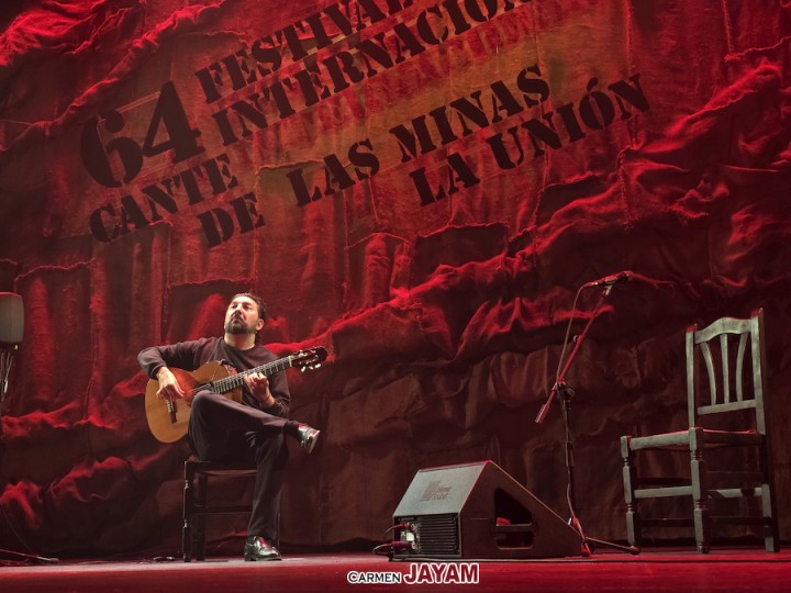 “Estoy tan emocionado que no puedo ni hablar, pero el corazón lo traigo hirviendo”, confesaba ante el público que anoche acudió a su gala del Festival Internacional del Cante de las Minas tras abrir el espectáculo con una taranta, solo, en un escenario en el que el dinamismo de su toque hizo dejarse llevar por el juego de intensidades que brindó desde la primera pieza. Fue tras esta primera interpretación cuando recordó su paso por el concurso de La Unión, especialmente al subir la rampa hacia el escenario. “Me he puesto ‘atacao’, como si fuera a concursar, pero al ver vuestro cariño me he puesto muy feliz y quiero que lo paséis bonito”, compartió, voceando un contundente “¡Viva La Unión!” que el público correspondió con aplausos; los primeros de muchos que le esperaban esa noche.