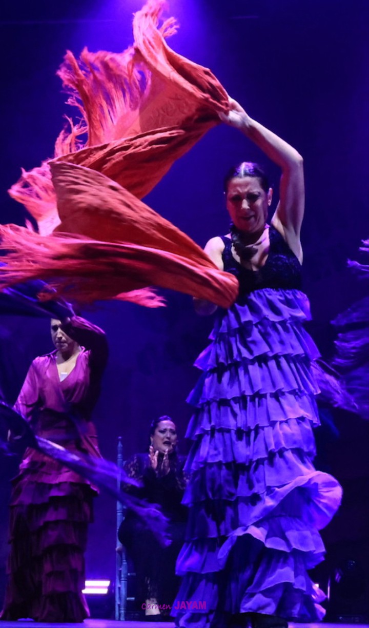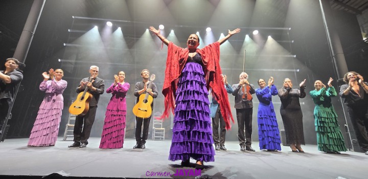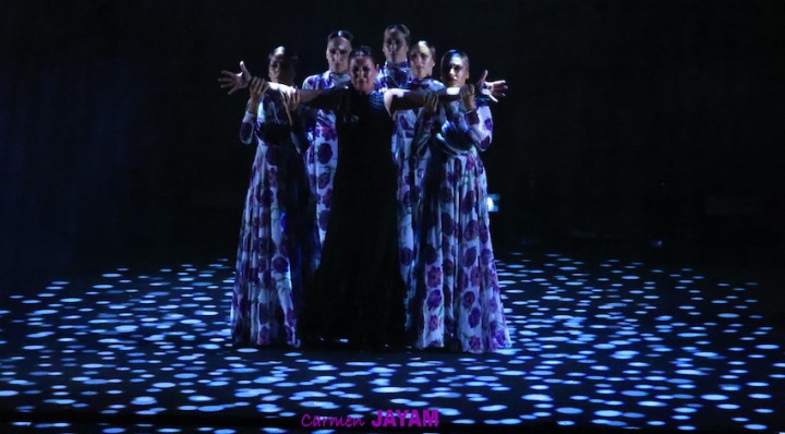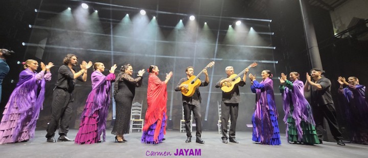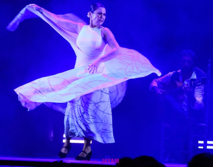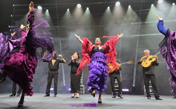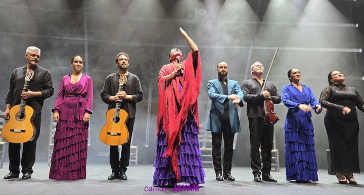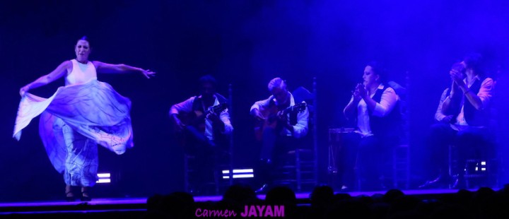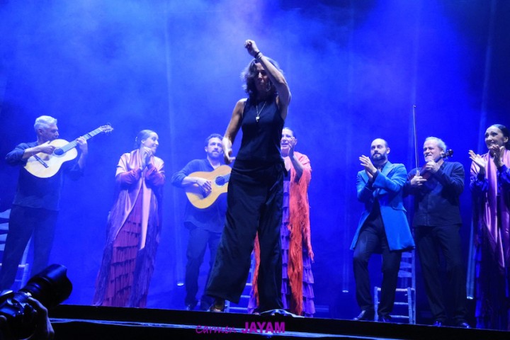 Por eso apareció en escena y se sentó en esa silla para comenzar su taconeo, ahora con fuerza, junto al director musical del espectáculo, Keko Baldomero. En casi penumbra, con la elegancia que la caracteriza, empezó a hacer los primeros guiños al cielo. No hubo que esperar mucho para que sonara una minera en este templo del flamenco, titulada ‘Voz’, porque la noche quería descifrar, a través de 15 piezas, el lenguaje del flamenco con “canciones de Paco y para Paco”. Con ‘Ritmo’ su cuerpo de baile salía a escena y mostraban, a golpe de bastón, una perfecta sincronización que daría paso a un segundo acto, “que representa el amor que le tenía al mar y a su tierra”.