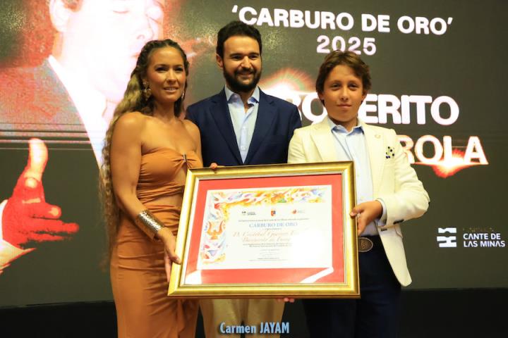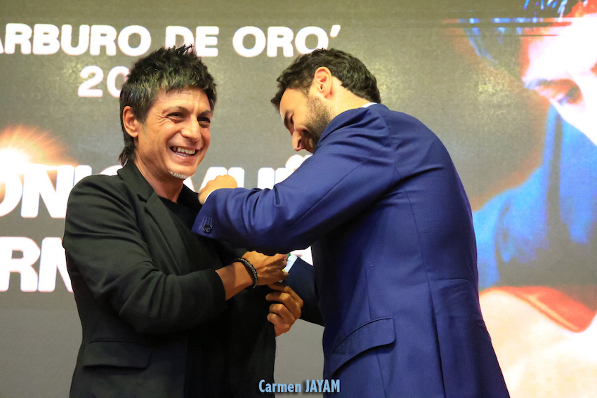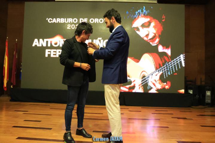 El ‘Carburo de Oro’ ha llegado hasta él en una jornada de la Agenda Cultural muy especial, al compartir reconocimiento, en este caso a título póstumo, con el cantaor Barquerito de Fuengirola por el 50 aniversario de su ‘Lámpara Minera’. El nieto del cantaor malagueño, que comparte como Barquerito el nombre artístico con su abuelo, se ha acompañado del toque de Muñoz para que ambos ‘Carburos de Oro’ hicieran un guiño al cielo, interpretando, a sus tan solo 12 años, la minera con la que ganó su abuelo y conmocionando a quienes allí se encontraban.