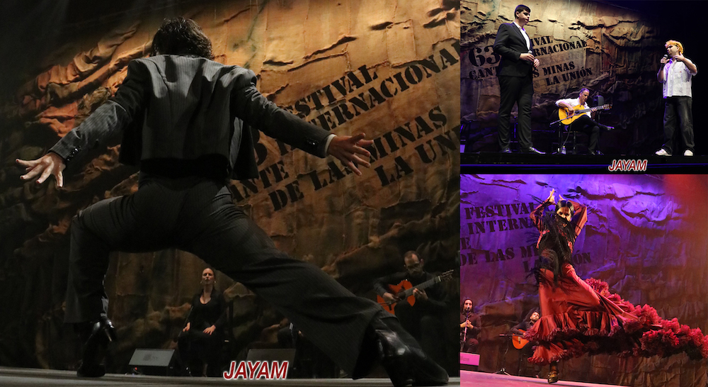 Tomás Parra y Miguel Ángel Sánchez ‘El Marqués’, representando al certamen 'Pascual García Mateos', abrieron la gala de los vencedores de la anterior edición del Cante de las Minas. En las fotos superiores también figuran los bailaores Yoel Vargas y Rocío Garrido.