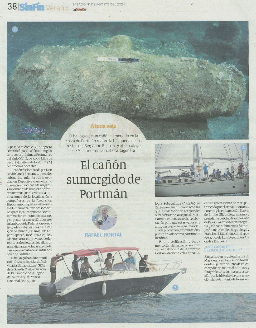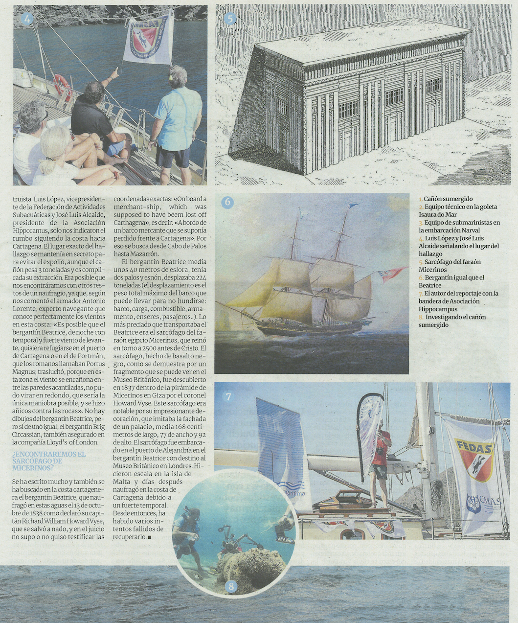 Rafael Hortal ha publicado un artículo en La Opinión en la que narra que a finales de agosto fue hallado un cañón sumergido que reabre la búsqueda de los restos del bergantín 'Beatrice', que naufragó entre Cartagena y Mazarrón en 1838 y que llevaba el sarcófago de Micerinos, quien reinó en Egipto unos dos mil quinientos años antes de Cristo y cuyo ataud lucía una impresionante decoración.