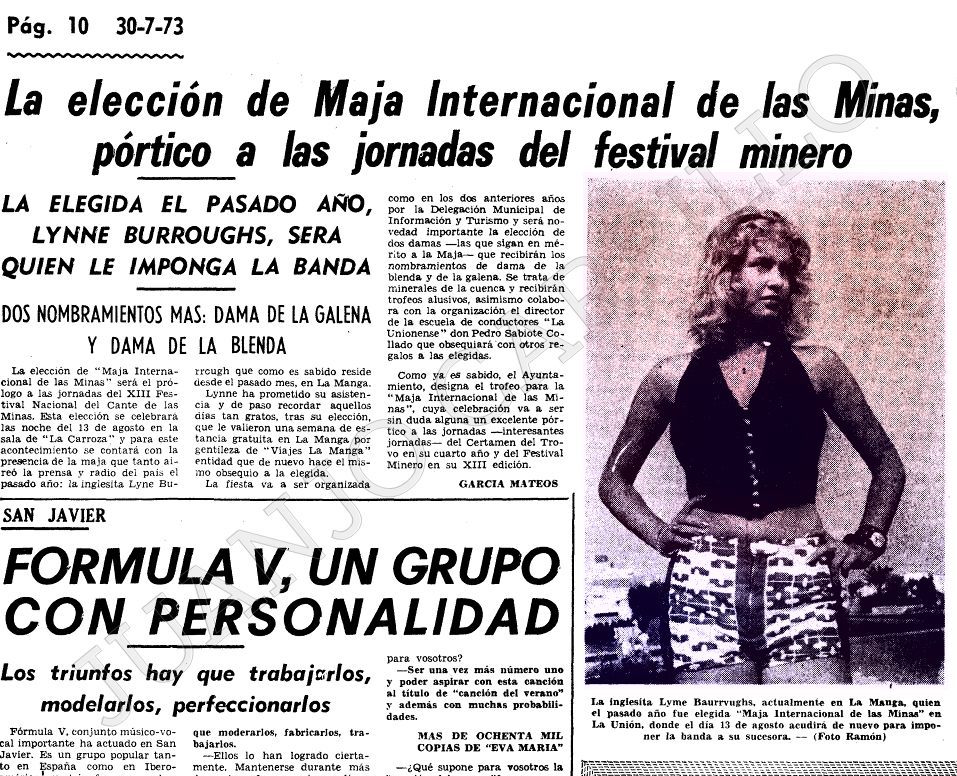 Juanjo Carrillo ('la-union-ciudad-del-cante-y-minera.es') ha descubierto que en los años setenta del siglo XX se efectuaba la elección de la 'Maja internacional de las minas' y de sus damas 'de la blenda y de la galena'. Las elegidas eran después el destino de trovos del 'Festival del Cante de las Minas'. La foto muestra un artículo firmado por el recordado Pascual García Mateos en el periódico 'La Verdad' anunciando la elección de 1973 y con foto de la maja de 1972, una joven británica.