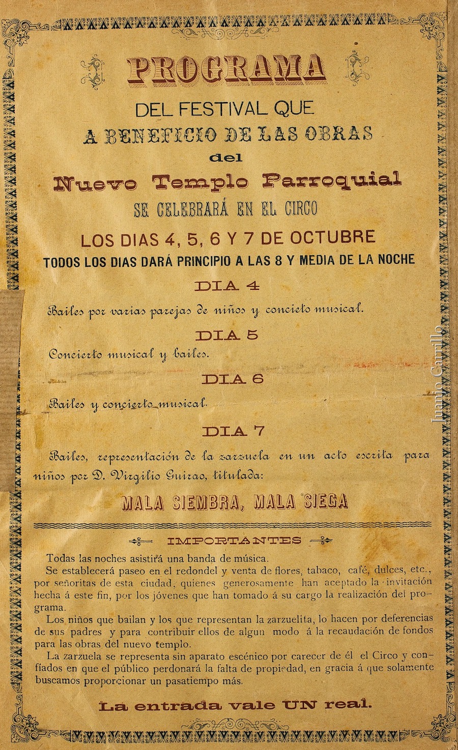 Juanjo Carrillo ('la-union-ciudad-del-cante-y-minera.es') rescata del año 1900 la celebración de la patrona, la Virgen del Rosario, con cuatro días de espectáculos (bailes, concierto y zarzuela) en 'el circo' siendo el precio de la entrada un real, moneda que ya no se utiliza y que figuró en el sistema monetario español entre los siglos XIV y XX. El dinero recaudado tenía como destino las obras del nuevo templo parroquial, al igual que el que se recogió de una novillada. También incluye un artículo escrito en octubre de aquel año por Jesús Carrillo dedicado a 'Las chicas de La Unión'.