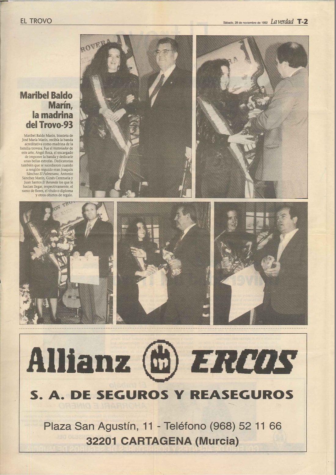Publicamos el suplemento especial de cuatro páginas que el diario La Verdad publicó, con fotos de Jayam, en noviembre de 1992 sobre la fiesta de exaltación del verso repentizado que organizó la Asociación Trovera José María Marín, que en esta gala nombrada como su primer socio de honor al informador y agitador cultural unionense "por contribuir a dignificar el trovo en el folklore regional", siendo el 'Repuntín' quien le impuso la insignia de oro.