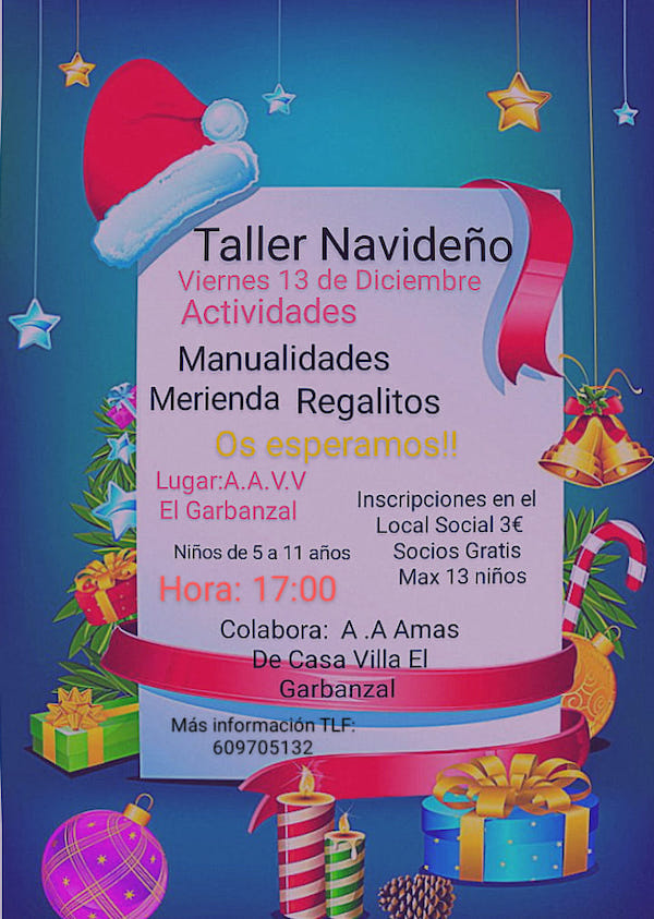 La jornada de manualidades dirigida a chavales de 5 a 11 años de edad tendrá lugar en la sede de la asociación de vecinos el 13 de diciembre, completando la tarde merienda y regalitos. Plazas limitadas. Inscripciones a 3 euros, siendo gratis para asociados.