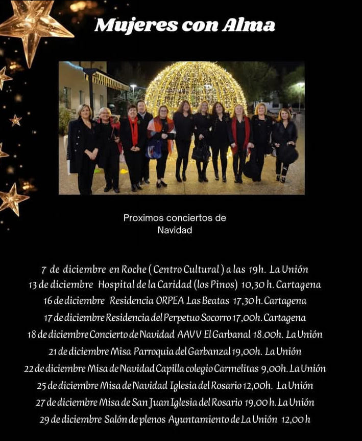 El grupo coral femenino de La Unión comienza las diez actuaciones que ha fijado para diciembre este sábado en el centro cultural 'Asensio Sáez'. Tras actuar en diferentes puntos de Cartagena, regresarán a tierra minera a partir del 18, con escalas en El Garbanzal, Carmelitas, Casa del Piñón e iglesias.