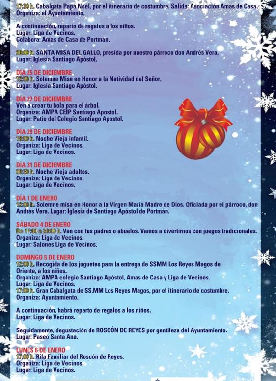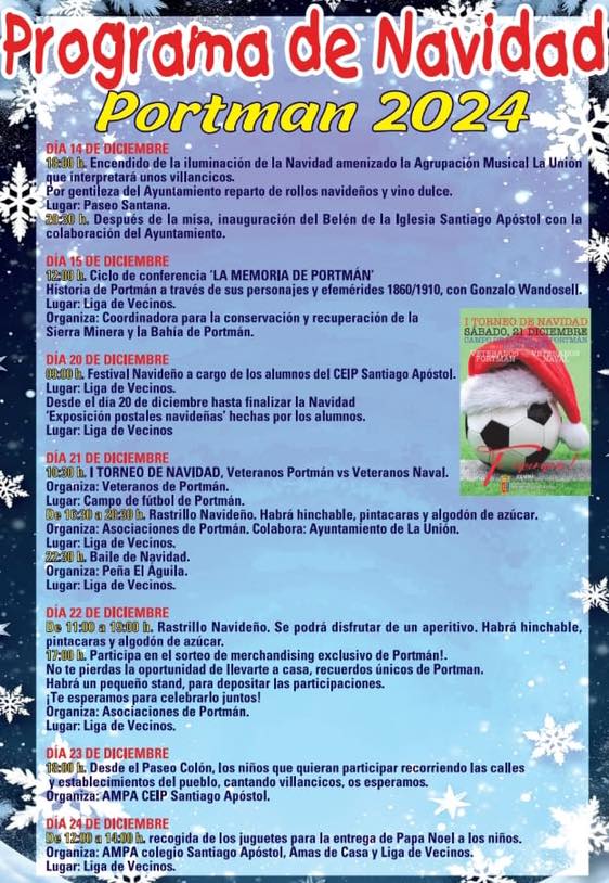 Esta tarde tendrán lugar el encendido de la iluminación navideña en un acto enriquecido por los villancicos de la Agrupación Musical La Unión. Después hay misa y puesta de largo del Belén de la iglesia de Santiago Apóstol. El domingo hay conferencia sobre 'La memoria de Portmán' a cargo de Gonzalo Wandosell. El programa de actos continuará hasta el 6 de enero.
