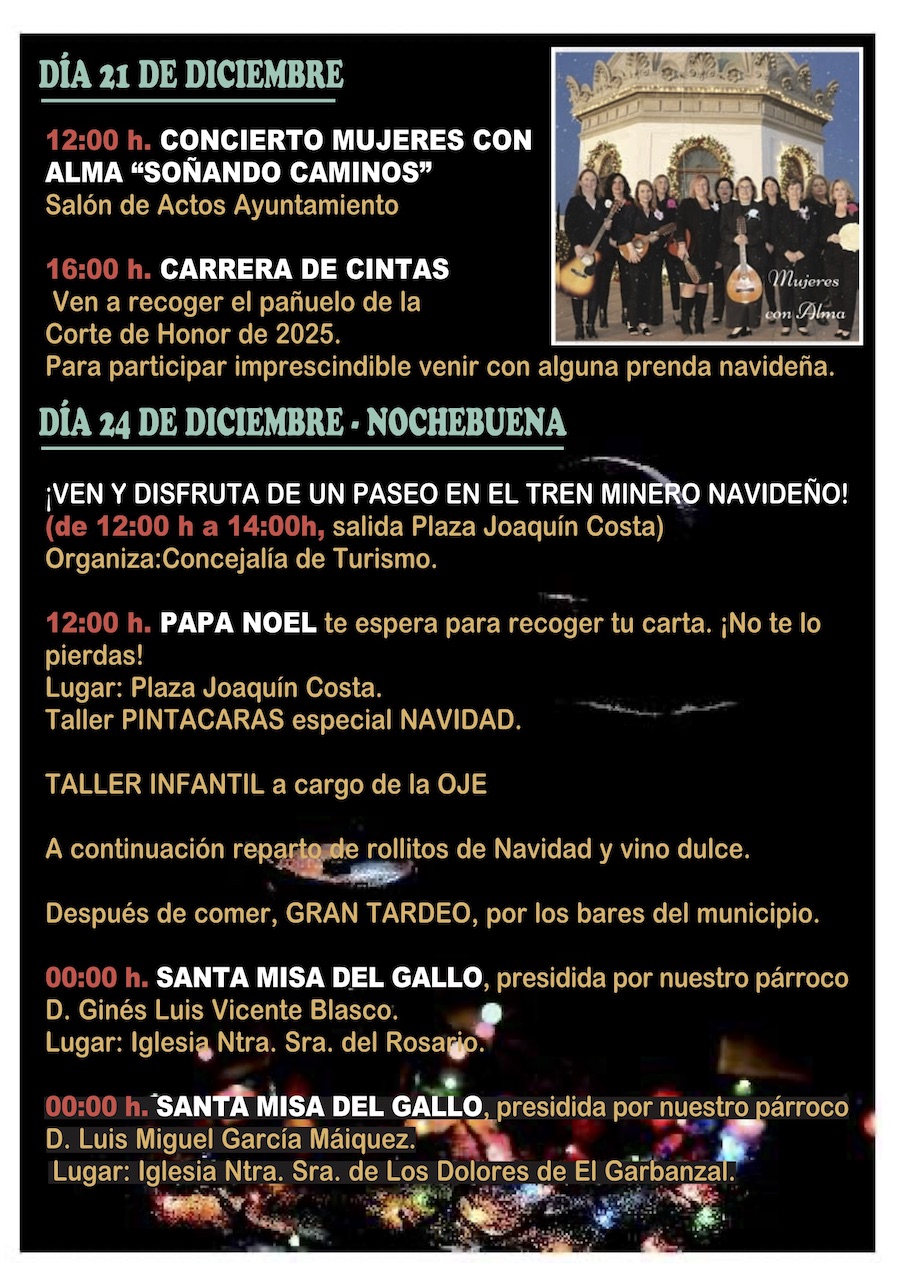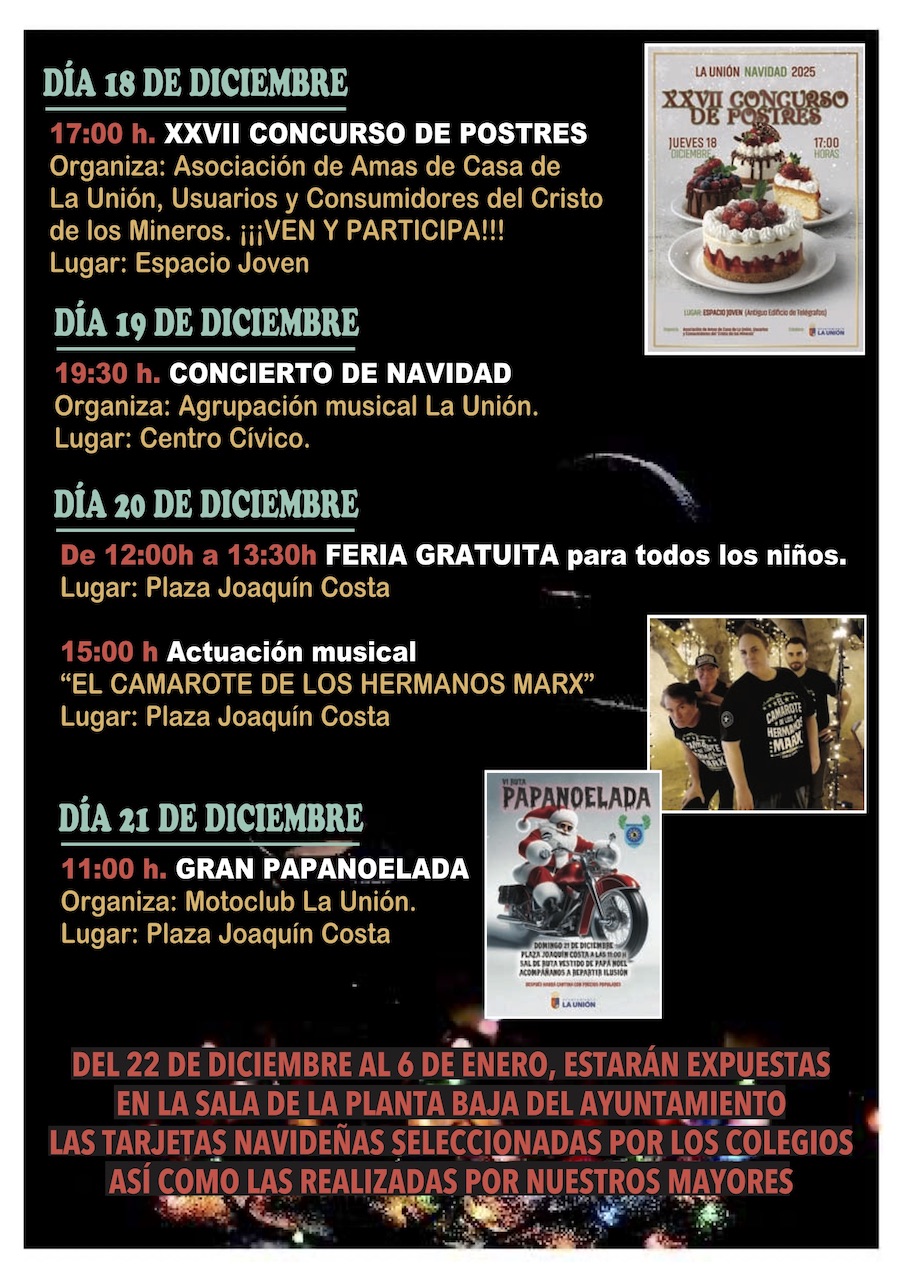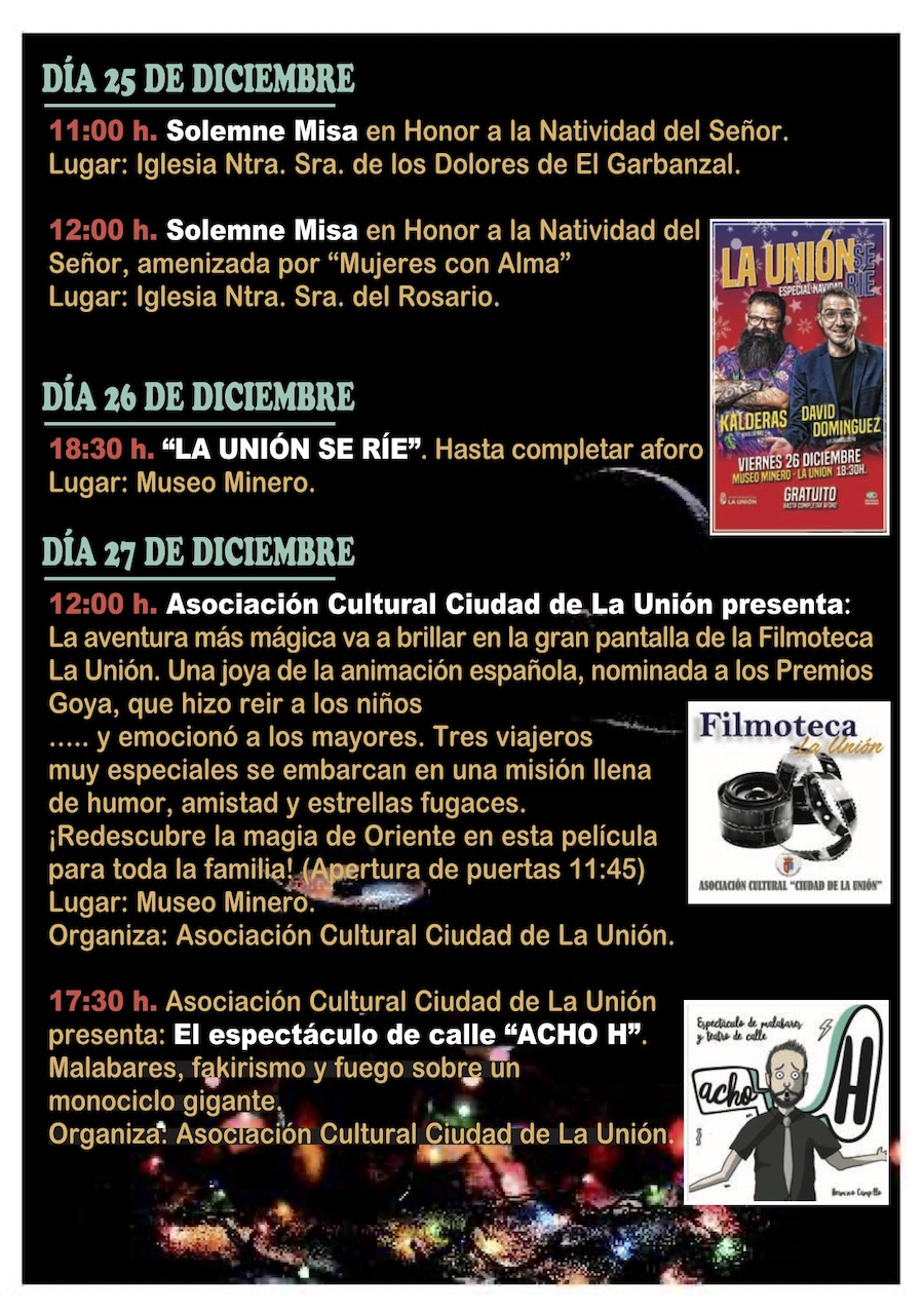 El Ayuntamiento de La Unión da a conocer el programa de actividades, que arranca este viernes con el encendido y la inauguración del Belén y que culminará el 6 de enero. Entre otras propuestas, hay música en directo ('Banda de ases', 'Amici Music', 'Concierto de Navidad', 'El camarote de los Hermanos Marx', 'Mujeres con alma' ), papanoelada motera, concurso de postres, exposiciones, carrera de cintas, doble monólogo, cine, musical infantil, preuvas, cabalgata de Reyes Magos, tren minero y actos religiosos.
