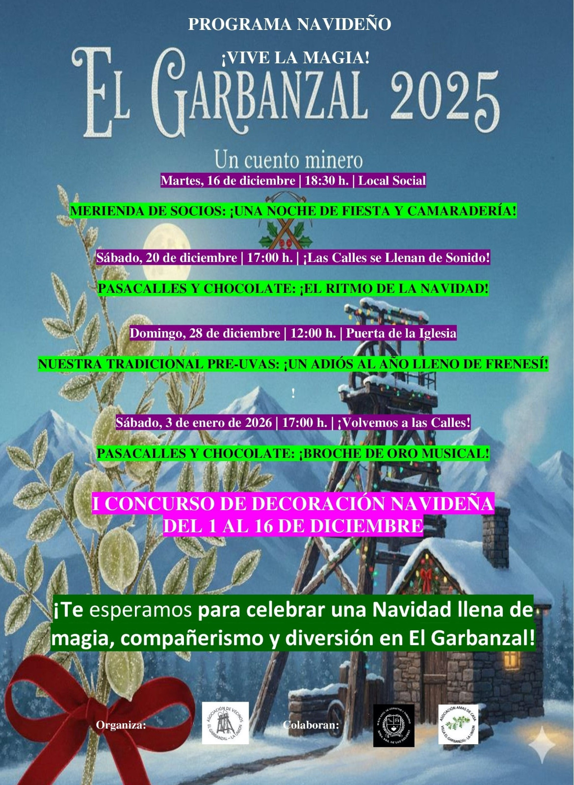 La asociación de vecinos, con la colaboración de las amas de casa y de la banda de música de Nuestra Señora de Los Dolores, desvela su programación navideña, en la que no faltarán las 12 uvas matinales del último día del año ante el reloj de la iglesia y en el que será novedad un concurso de decoración navideña. Pasacalles, música y chocolatadas también figuran entre sus propuestas para alegrar estas fechas en la villa.
