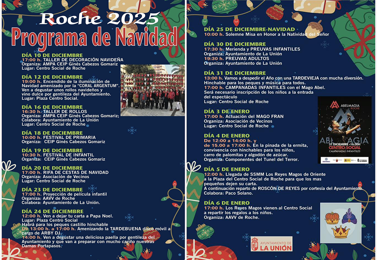 Esta tarde-noche tiene lugar el encendido de la iluminación en la plaza del centro cívico rochero, en un acto enriquecido por las voces de la coral Argentum y el obsequido de vino dulce con rollos navideños a cargo del Ayuntamiento de La Unión. El programa de actos se extenderá hasta la llegada de los Reyes Magos el 6 de enero.