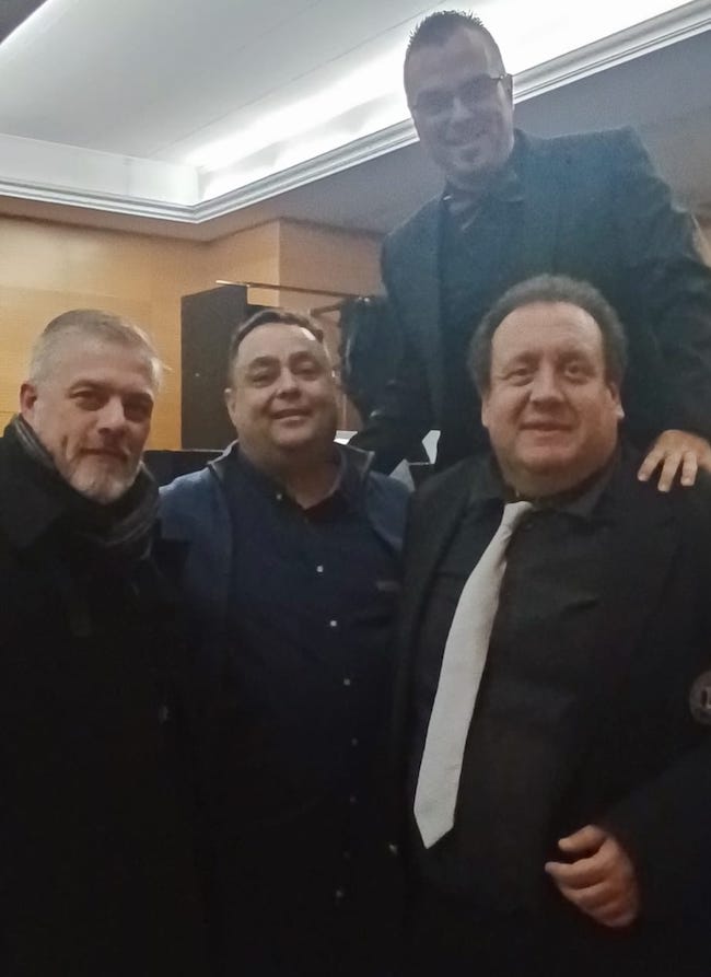 Entre los numerosos asistentes se encontraban el alcalde, Joaquín Zapata, y las ediles Dami García y Loly Mendoza (PP), del equipo del gobierno municipal, y el edil Daniel Cano y directivo Francisco Amor de Defiende La Unión, a quienes se observa en la foto adjunta junto a Luis González director de la banda titular, y José Gabriel Rosique, músico y presidente de la Agrupación Musical La Unión.