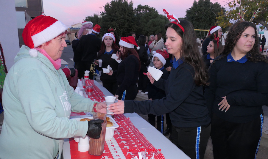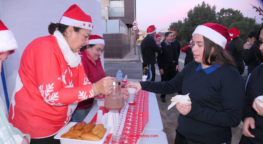 Cornetas y tambores recorrieron diversas calles, para después, en la plaza de Joaquín Blume, junto a la entrada al patio de las asociaciones de vecinos y de amas de casa, llevarse a cabo una chocolatada con bollos, durante la que los presentes también se podían fotografía con carteles de Papá Noel y de un árbol de Navidad.