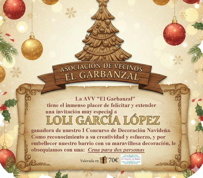 La primera edición del concurso de decoración navideña organizado por la Asociación de Vecinos de El Garbanzal ya tiene vencedora en la vivienda de Loli García López, que se observa en las imágenes.