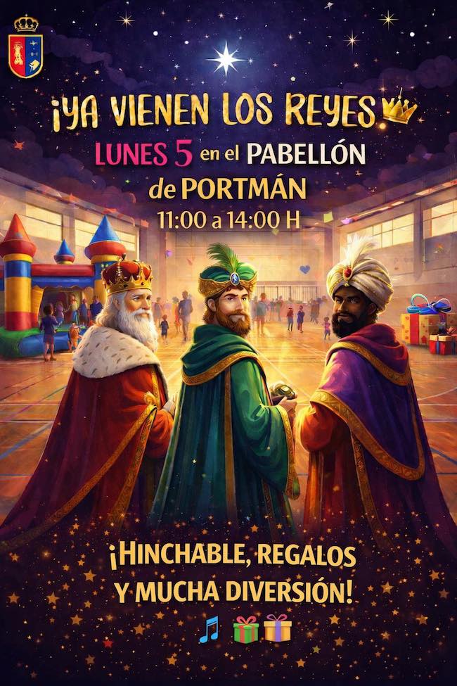 El Ayuntamiento de La Unión informa del cambio previsto en Portmán, donde finalmente habrá un encuentro con los Reyes Magos en el pabellón deportivo por la mañana, de 11 a 14 horas, que contará también con la instalación de hinchables para diversión de los niños.