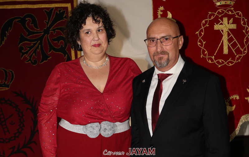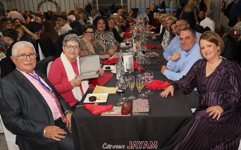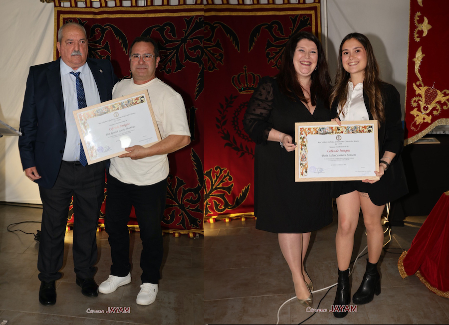 La cena-gala de la Cofradía del Cristo de los Mineros acogió la entrega de distinciones por parte de las siete agrupaciones a sus hermanos con diferentes reconocimientos, siendo el principal el nombramiento de 'cofrades insignes'. En la foto, Antonio Meroño (a la izquierda del lector) con el título de 'Hermano de honor' que le había entregado la presidenta de La Dolorosa, Celia Hermógenes (derecha de la imagen).