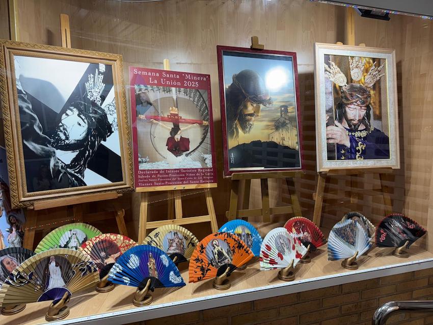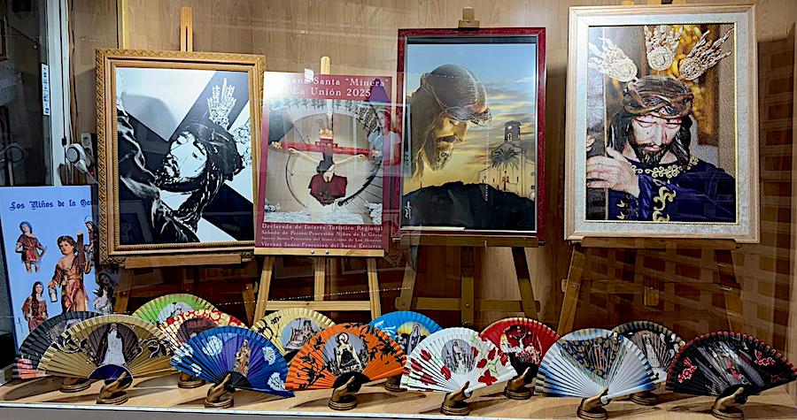 El escaparate muestra estos días fotos del Cristo de los Mineros y del Nazareno, además de abanicos con las tallas que salen en procesión en La Unión.
