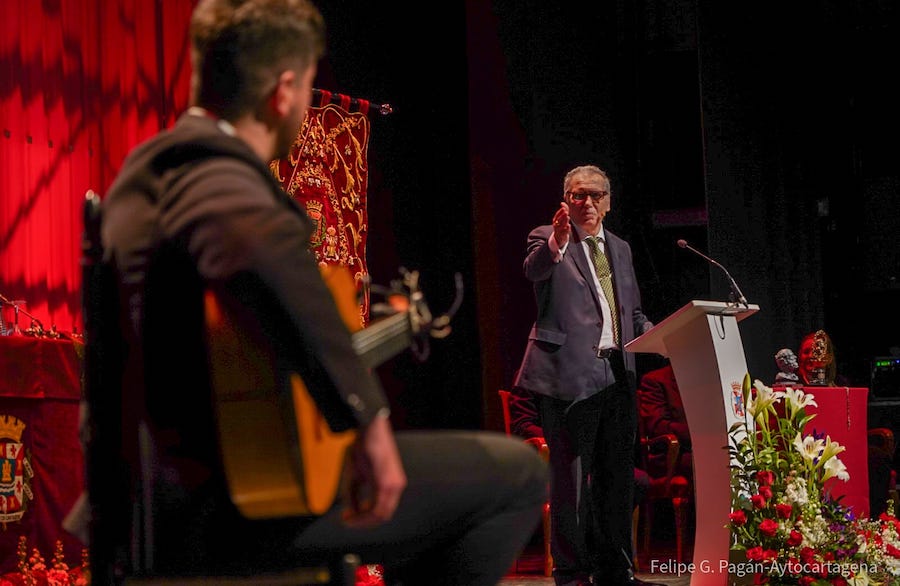 En su pregón de la Semana Santa cartagenera, el también cronista oficial de la capital de la Sierra Minera plasmó con datos 'el vínculo de fe' que une a ambas poblaciones durante una muy amena oratoria, que tuvo como marco El Batel, en la que contó con el acompañamiento musical del guitarrista unionense Pablo Barrionuevo, quien ofreció, entre otros temas, una versión novedosa de la marcha 'Mektub'.