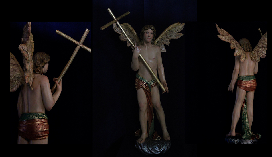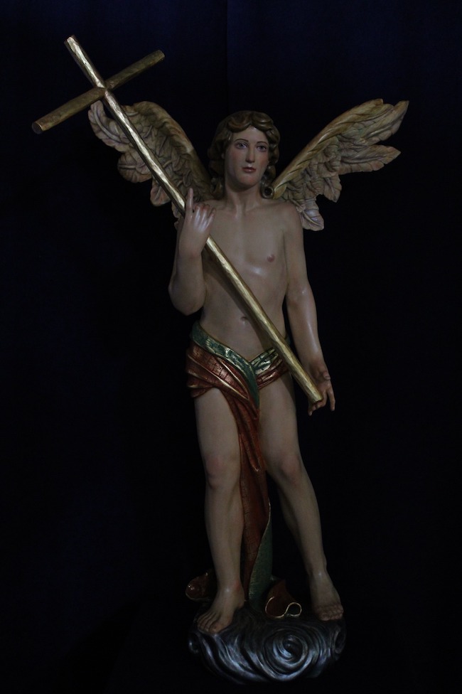 Se trata de una escultura de madera policromada y estofada, de 1,10 metros de altura, que representa el ángel que anuncia la resurrección de Cristo. La talla de Galo Conesa abrirá la próxima procesión de gloria y será portada por los niños de la hermandad. Es el segundo encargo que nuestro escultor recibe de la hermandad morada, ya que en 2015 realizó el paso de Las Negaciones de San Pedro, grupo compuesto por cuatro esculturas.