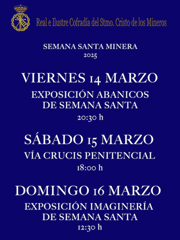 La Real e Ilustre Cofradía del Santísimo Cristo de los Mineros anuncia los siguientes actos que este viernes se inaugura una exposición de abanicos con temática de Semana Santa, que el sábado será el vía crucis desde la mina Agrupa Vicenta y que el domingo tendrá lugar una muestra de la imaginería sacra en el Museo Minero.