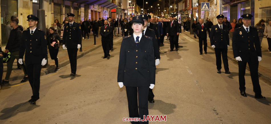 El Cristo de los Mineros tuvo una escolta especial anoche, tras salir de la plaza de la iglesia de la Virgen del Rosario. Se trataba de jóvenes agentes de la Policía Nacional que iban abriendo paso por el trayecto urbano hacia la Casa del Piñón, donde el crucificado quedó ubicado en la entrada, mientras que en el salón de actos tuvo lugar el hermanamiento entre el Cuerpo Nacional de Policía y la Real e Ilustre Cofradía del Cristo de los Mineros.