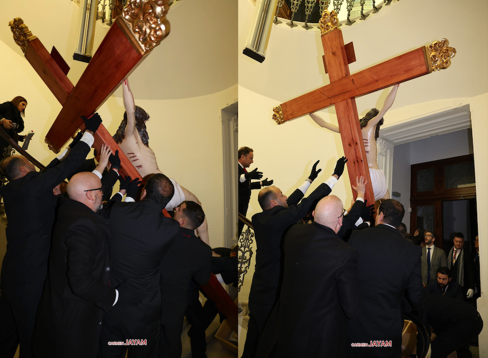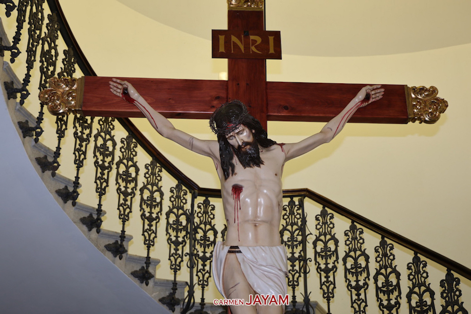 La imagen del emblemático crucificado que descendió ayer desde la mina Agrupa Vicenta quedó instalada en la entrada de la modernista sede municipal, la Casa del Piñón, donde puede ser visitada por los vecinos hasta que acabe la Semana Santa Minera. Se trata de una réplica estrenada en el año 2022 de la talla original, que se encuentra en la iglesia del Rosario.