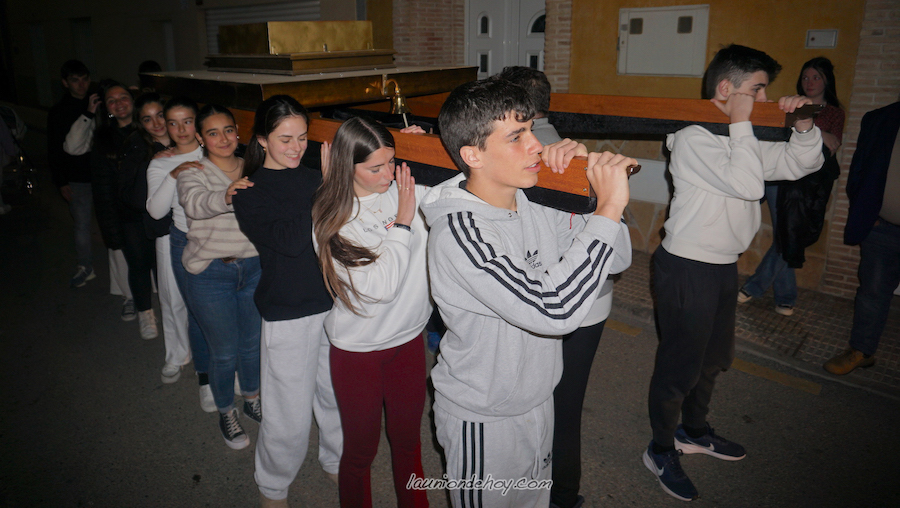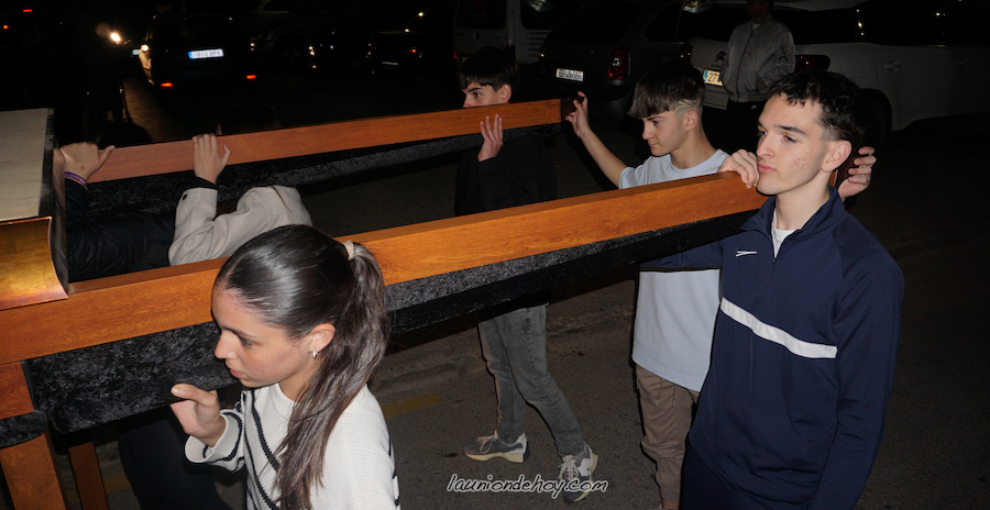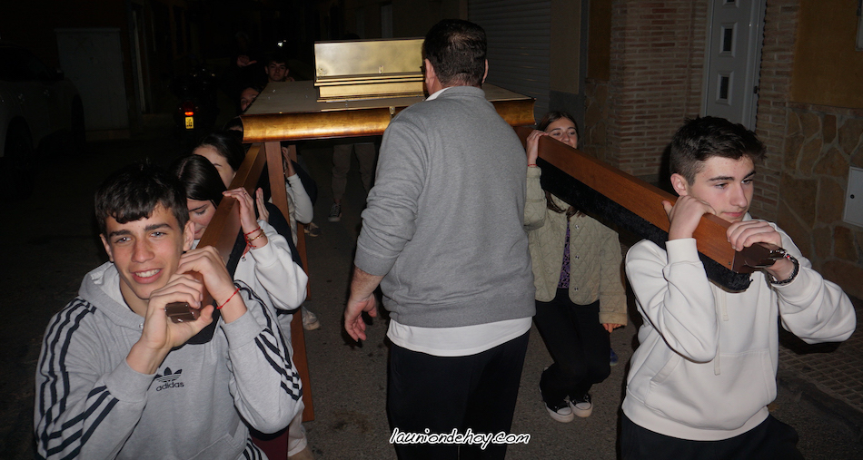 Durante una jornada de tallaje y ensayo en el entorno del almacén de tronos de la calle Siete de Marzo tuvimos la ocasión de hablar con estos adolescentes, quienes indicaban que habían aceptado de forma voluntaria llevar el trono por su fe y por colaborar con la continuidad de la Semana Santa Minera. Los chavales lo hicieron muy bien en el ensayo con el paso marcado a golpe de tambor, el cual culminó en el interior de la nave con una ovación conjunta entre ellos y el presidente de la agrupación, Antonio Pagán López.