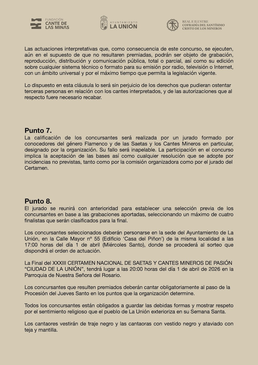 El eco de las minas se vuelve rezo en La Unión. La Fundación Cante de las Minas, junto al Ayuntamiento de la localidad y la Ilustre Cofradía del Santísimo Cristo de los Mineros, ha anunciado la apertura del plazo de inscripción para el XXXIII Certamen Nacional de Saetas y Cantes Mineros de Pasión “Ciudad de La Unión”.