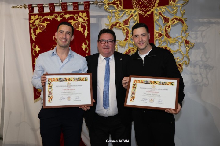La velada de la familia procesionista de La Unión incluye la entrega de las distinciones de ‘cofrades insignes’ por parte de las agrupaciones dentro de un capítulo que se extendió al nombramiento de Alfonso Almagro como presidente de honor de la Caridad (foto junto a estas líneas) y la imposición de la insignia de plata sanjuanista a Francisco Silvente entre otras distinciones extras.