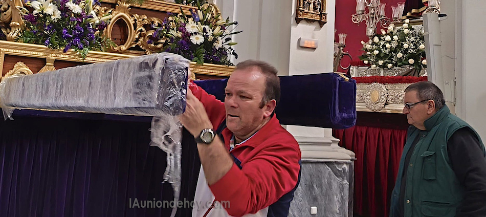 Los procesionistas de la ciudad de La Unión han estado trabajando hoy en el interior del templo del Rosario para tenerlo todo preparado para esta noche, cuando se ponga en marcha la procesión del Santísimo Cristo de los Mineros.