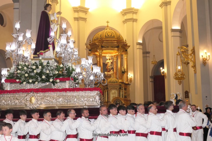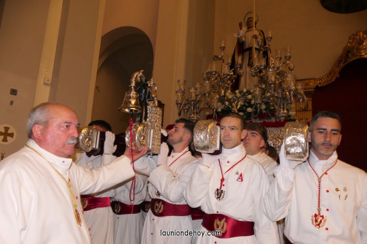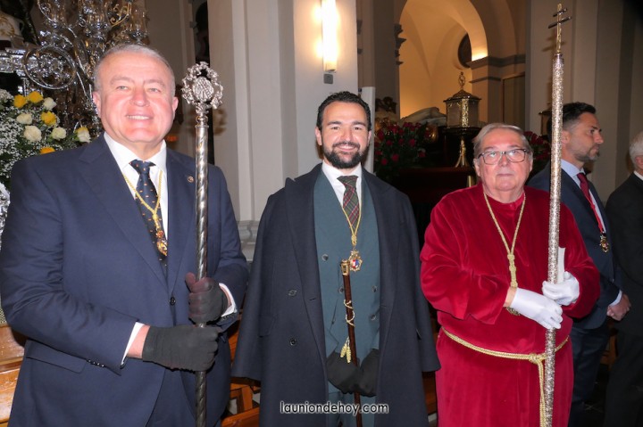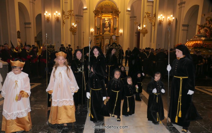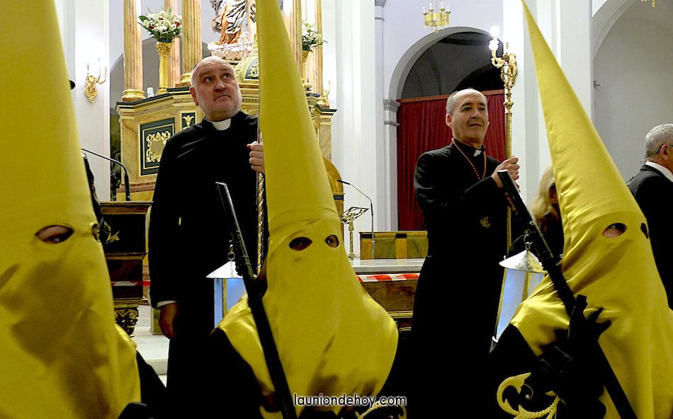 Todos esperan en el exterior hasta que van entrando conforme al orden de salida. En el interior todo transcurre de forma casi perfecta merced al buen trabajo del equipo de iglesia y de los coordinadores de cada agrupación. Las autoridades son de las primeras personas en entrar, situándose en un lateral para contemplar cómo va saliendo todo el cortejo. Entre ellos está el concejal Francisco García Molina, que ha anunciado que deja el cargo, por lo que vive sus últimas jornadas como edil. Junto al equipo de gobierno (PP) está el senador Francisco Bernabé, sumándose el cronista oficial de La Unión, Gonzalo Wandosell, y el hermano mayor cofrade, José Cortado.