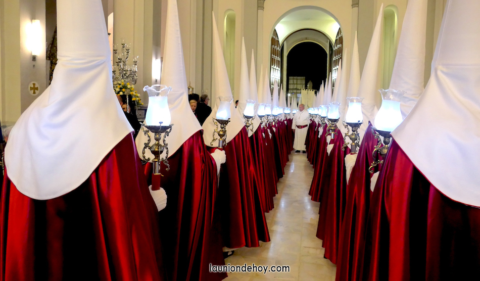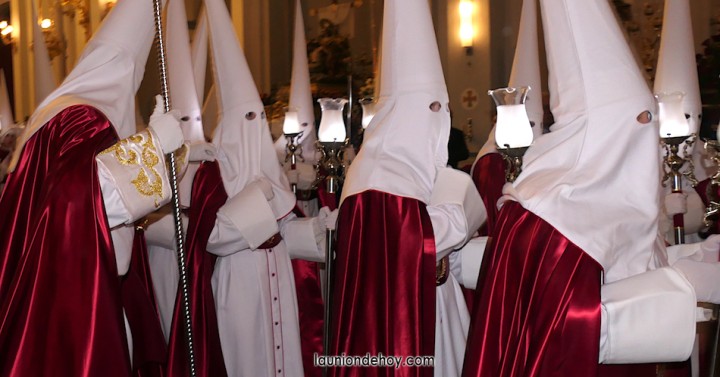 Se acerca la hora de comenzar la procesión del Jueves Santo en la ciudad de La Unión y por las calles comienzan a verse cada vez más personas con atuendo procesionista andando con dirección hacia el templo de la patrona, lugar donde cada año emergen las procesiones. También los hay que llegan en turismos que se detienen unos instantes lo más cerca posible para que se bajen.