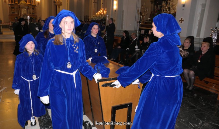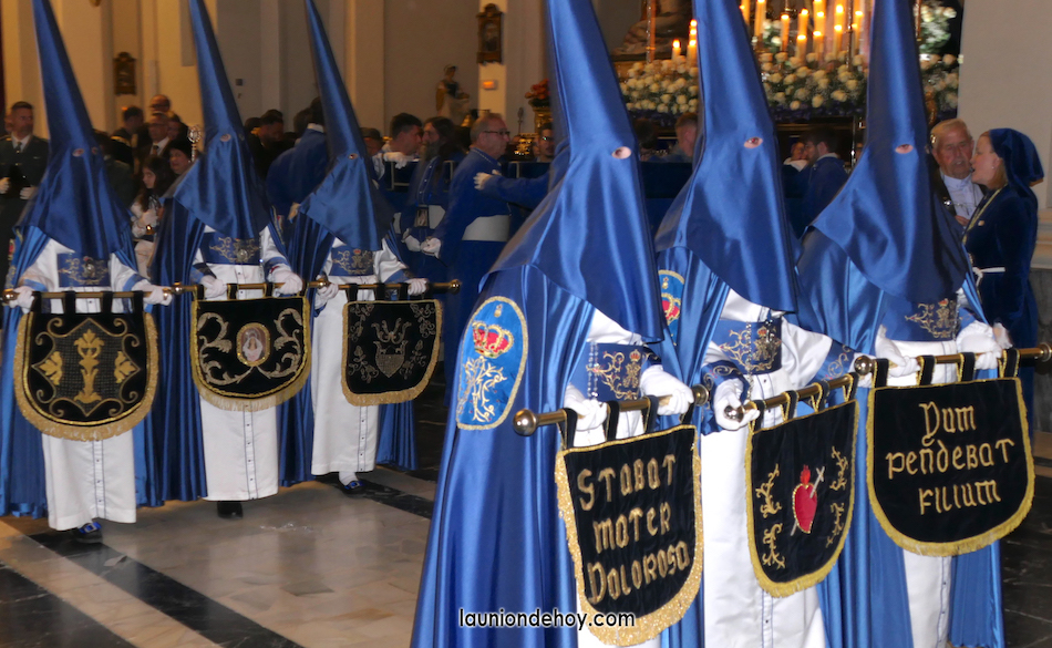Las penitentes llevan los mensajes 'Stobot Moter Doloroso' (motor dolorsamente silencioso) y 'Dum Pendebat Filium' (mientras ahorcaba a su hijo) junto a galas con el corazón atravesado por un puñal y otras con la imagen y símbolos de la Virgen, cerrando la imagen bajo palio y rodeada de velas y flores, pero hay que destacar que en la Semana Santa Minera el adorno floral es el justo para lucir sin tapar.
