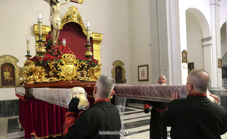 Mientras esto ocurre, procesionistas de la agrupación del Cristo de los Mineros colocan las varas al trono, que permanece en el mismo lugar donde ayer escuchó las voces de saetas y cantes minero del concurso nacional de La Unión.