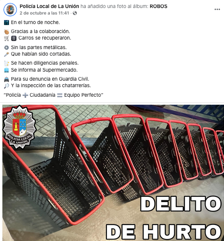 La Policía Local de La Unión da a conocer algunas de sus actuaciones de este mes (al margen de las fiestas), entre las que figura el conductor que difundió imágenes de cómo alcanzaba esa velocidad por la autovía, siendo identificado, abriéndose diligencias por el delito. También se da a conocer el robo de ocho carros de un supermercado y el arresto de un hombre que estaba inmerso en un conflicto que causaba molestias en una plaza y que resultó tener una orden de detención de un juzgado de Torrevieja.