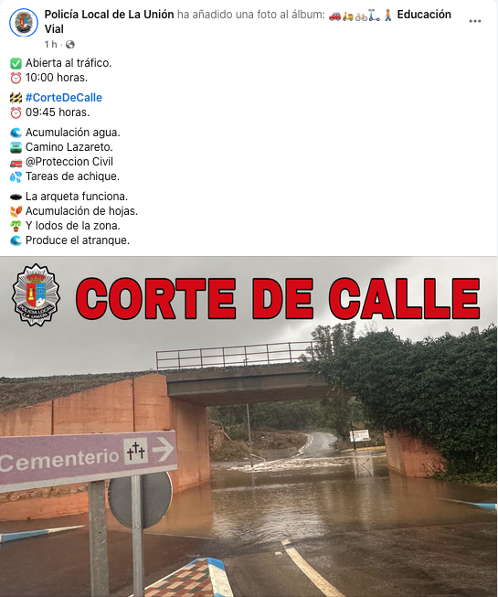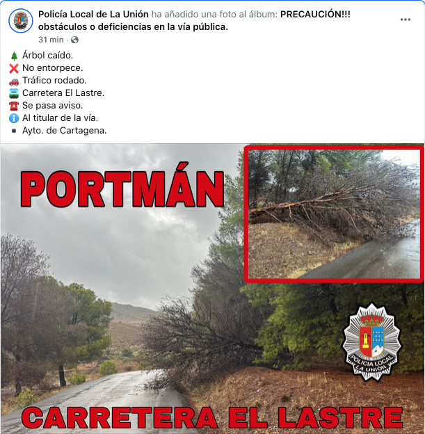 Se ha producido en la carretera de El Lastre, en Portmán, dentro de la lluviosa jornada de hoy durante el paso de la DANA 'Alice'. La Policía Local de La Unión también informa que se reabre el paso por debajo del puente en el camino hacia el Lazareto, donde el agua se estancó al taponar la acumulación de horas la arqueta. También reseñar que se han suspendido las actividades náuticas en todo el litoral de la Costa Cálida y los exámenes para el carné de conducir en Cartagena.