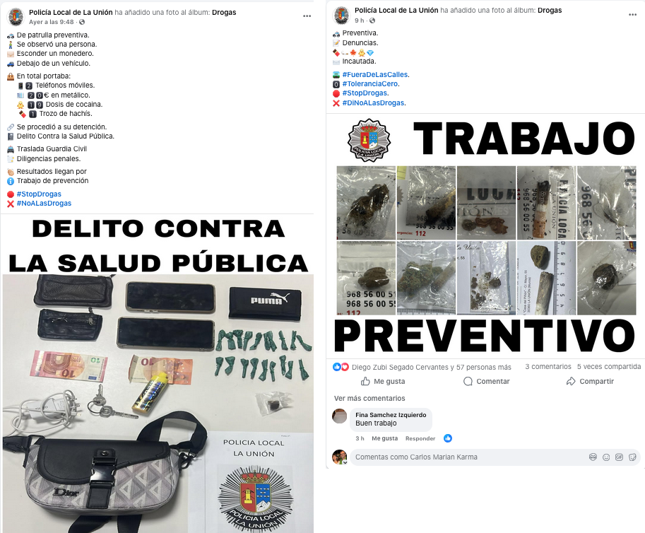 La Policía Local informa en su perfil de Facebook de diversas cantidades de estupefacientes incautadas en los últimos días y de la denuncia contra una persona que portaba 19 dosis de cocaína y una de hachís.