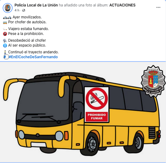 La Policía Local de La Unión informa que este jueves fue avisada por el chófer de un autobús de que un viajero estaba fumando dentro del vehículo pese a estar prohibiendo, desobedeciendo al conductor. Los agentes se personaron y el fumador tuvo que continuar el trayecto andando.