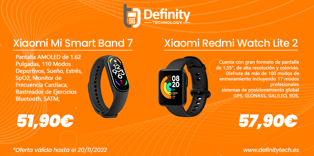 Xiaomi Mi Smart Band 7 y Xiaomi Redmi Watch Lite 2 se pueden conseguir por 51,90 y 57,90 euros, respectivamente, sólo hasta el domingo. Recuerda que estamos en la calle Mayor de La Unión y en www.definitytech.es
