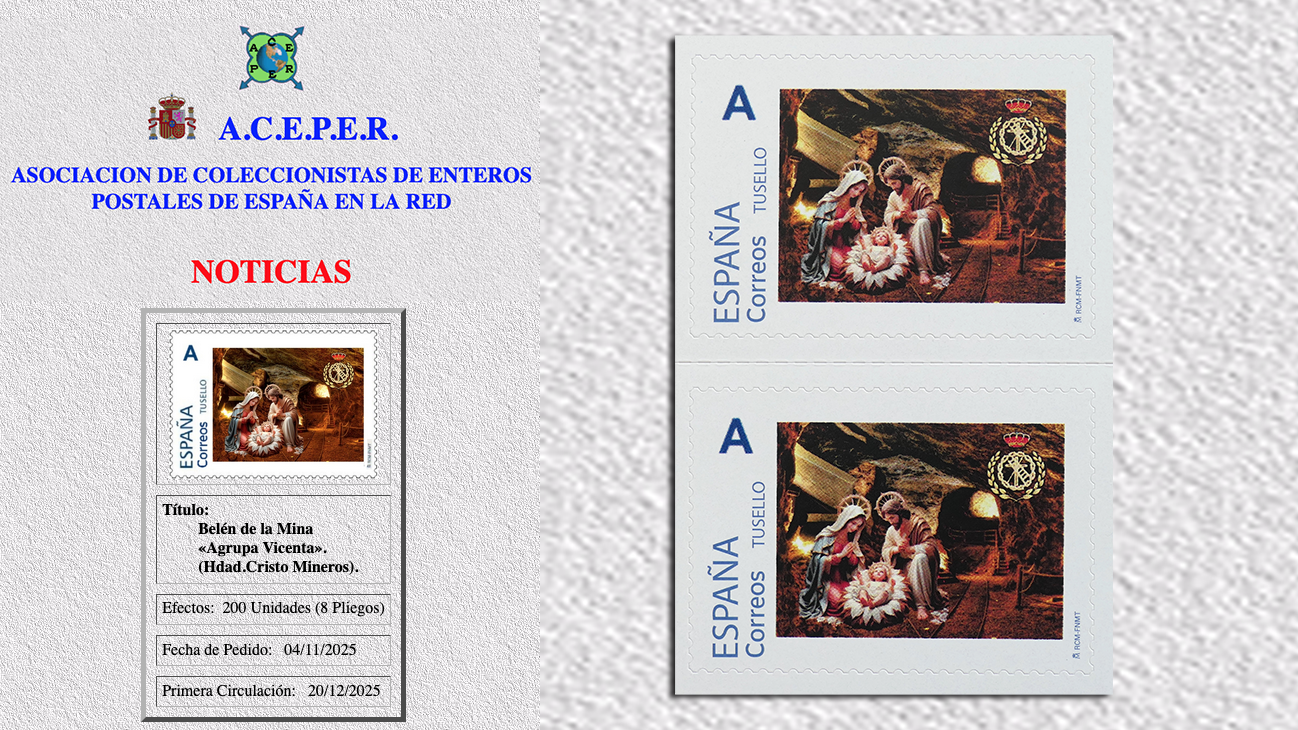 El sello oficial con la imagen del nacimiento de Jesús dentro de la Agrupa Vicenta, que ha editado la Cofradía del Cristo de los Mineros a través de Correos, ha sido incluido en los portales de la 'Asociación de coleccionistas de enteros postales de España en la red (Aceper)'.