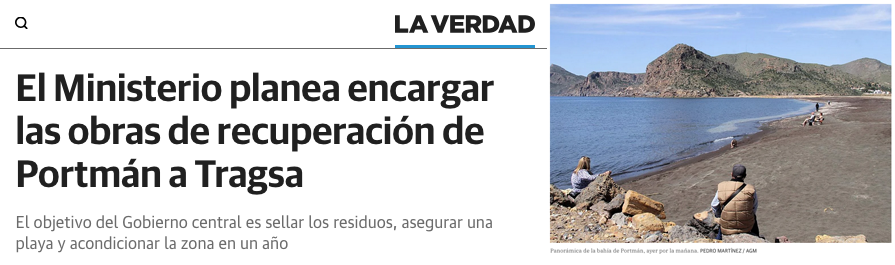 Así lo refleja el artículo que publica hoy La Verdad, periódico que sigue siendo el medio por el que vecinos y políticos conocen de primeras las intenciones y decisiones de ministerio, el cual sigue 'pasando' de la comisión de seguimiento de la que forman parte residentes, colectivos y autoridades. Los empresarios de la Región de Murcia alzan la voz contra el Estado por no sacar los trabajos de la bahía a concurso público.
