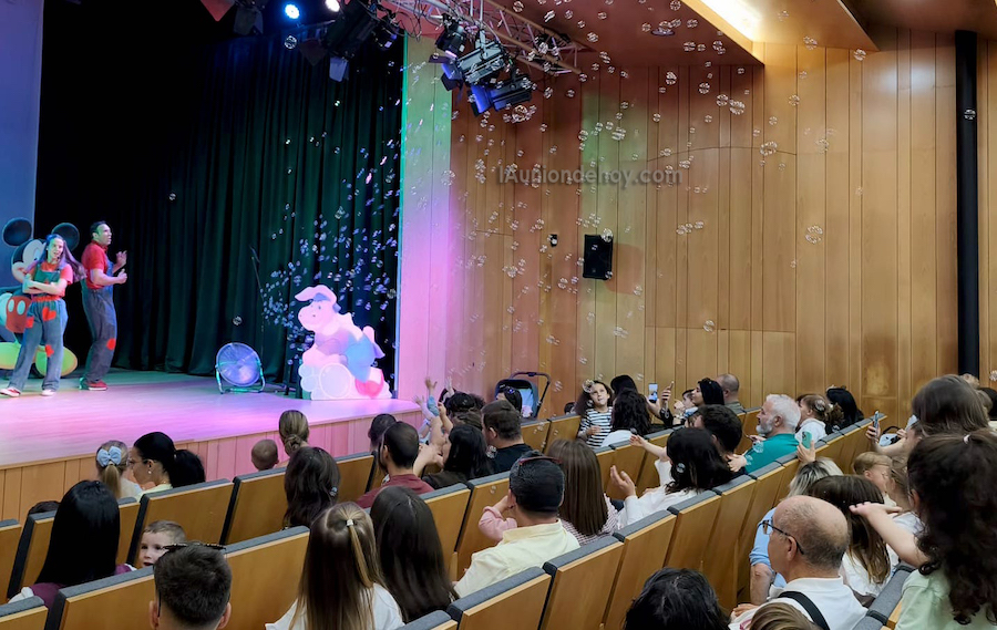 Un elevado número de niños y sus familiares pasaron una tarde muy animada en el salón de actos del Museo Minero con el cantajuegos del grupo 'Fantasía' titulado 'Bailando con burbujas'.