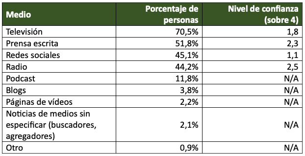 La mayoría de residentes en el territorio autonómico (70,5%) se entera de las noticia a través de la televisión, el medio preferido en la comunidad. Le siguen la prensa escrita (en papel o web con un 51,8%), las redes sociales (45,1%) y la radio (44,2%). Los murcianos valoran su grado de información sobre lo que sucede en España con un 2,7 sobre 4.