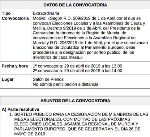 El ayuntamiento de La Unión informa de la convocatoria de pleno para el próximo lunes, a las 13 horas, para el sorteo público de cara a las elecciones locales, autonómicas y europeas que tendrán lugar el 26 de mayo.powered by social2s